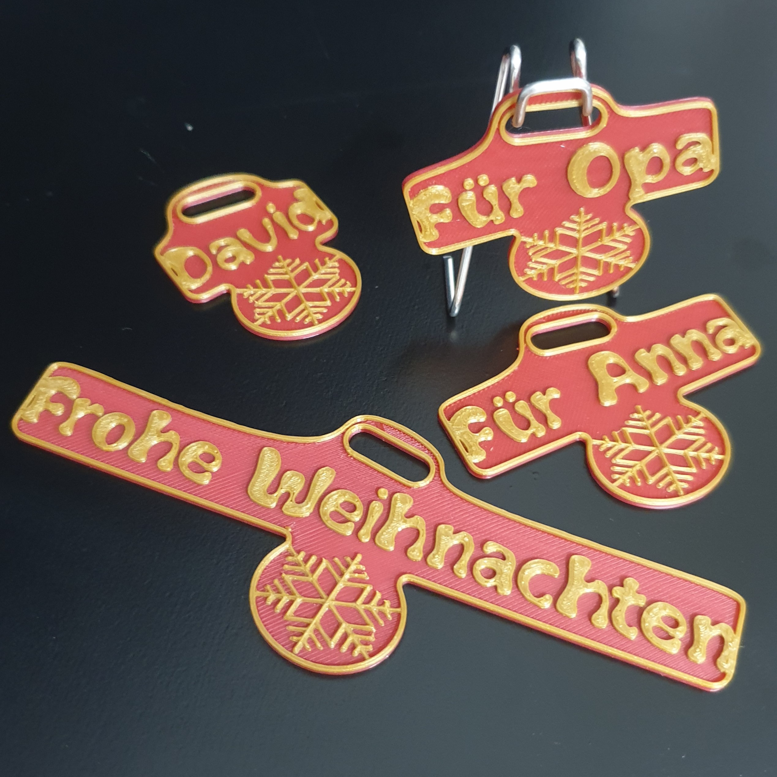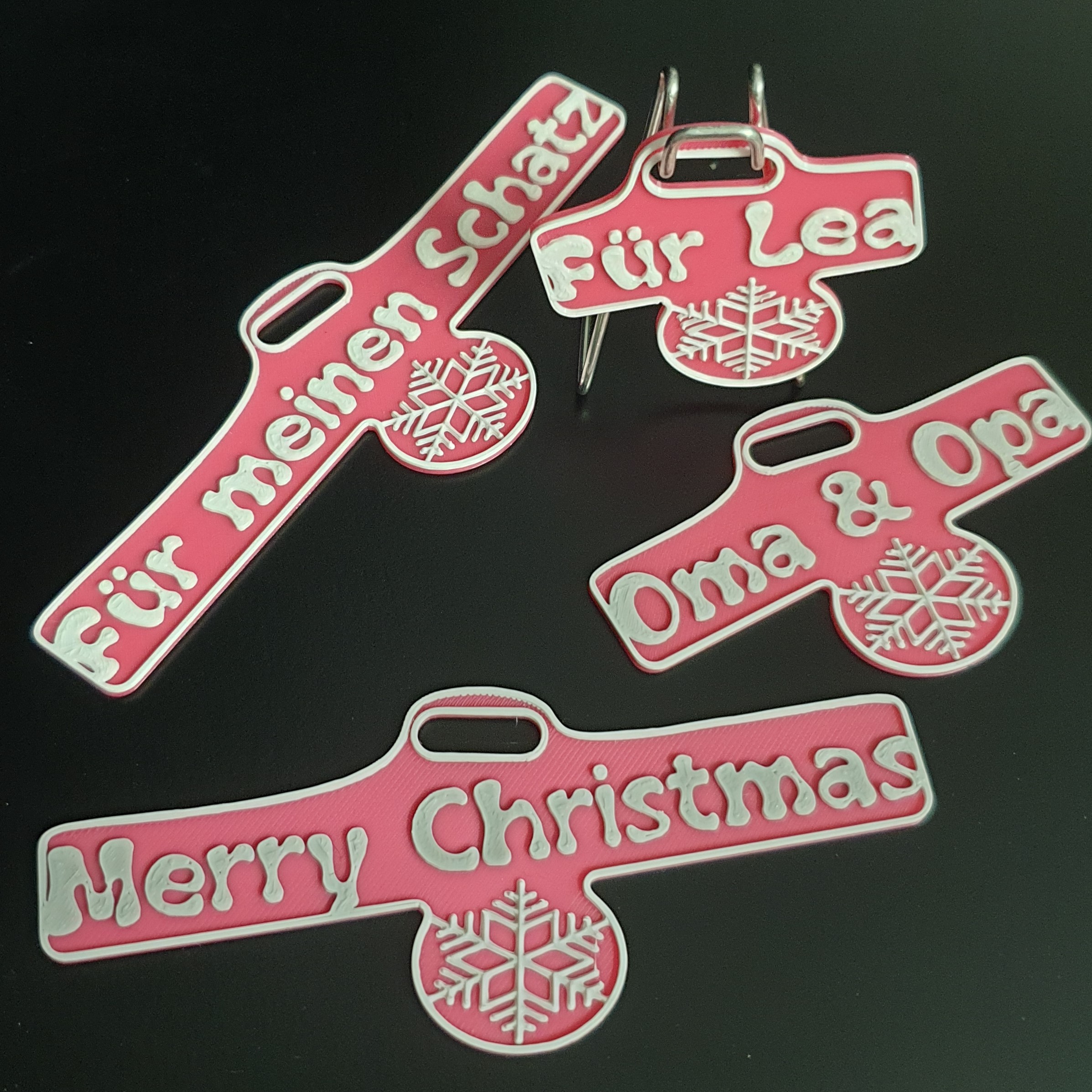 Mit diesen persönlichen Geschenkanhängern für Weihnachten wird Geschenke verteilen noch schöner. Dein Wunschtext wird in ein 3d Modell gewandelt und im 3d Druckverfahren nur für dich hergestellt. Du kannst immer 4 Stück im set bestellen. Möchtest du 8 verschiedene Schilder, bestellst du einfach ein weiteres set mit deinen 4 Wunschtexten
